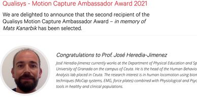 El Director de HubemaLab, José Mª Heredia Jiménez, ha sido galardonado con el premio "Motion Capture Ambassador Award 2021". Un reconocimiento a nivel mundial por su conocimiento y networking en los sistemas de captura de movimiento